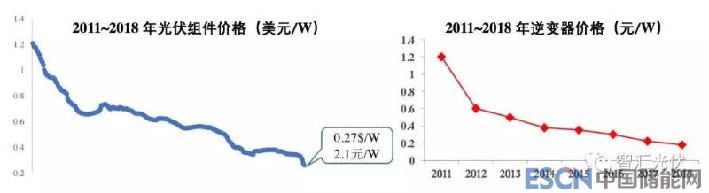 圖:2011~2018年光伏組件、逆變器的價(jià)格變化趨勢(shì)