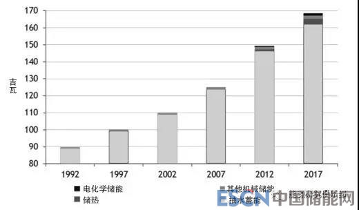 根據(jù)美國能源部全球儲能數(shù)據(jù)庫的數(shù)據(jù),1997~2017年,全世界儲能系統(tǒng)裝機增長了70%,到170吉瓦左右(見圖2)。如今儲能市場在各國政府的政策鼓勵下得到了積極的發(fā)展,最近幾年間新建儲能項目及其裝機總規(guī)模有望增加數(shù)倍。