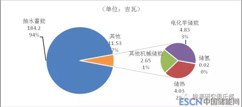 中國的儲能產(chǎn)業(yè)雖然起步較晚,但近幾年發(fā)展速度令人矚目。目前,國內(nèi)儲能側(cè)重示范應(yīng)用,積極探索不同場景、技術(shù)、規(guī)模和技術(shù)路線下的儲能商業(yè)應(yīng)用,同時規(guī)范相關(guān)標準和檢測體系。根據(jù)中關(guān)村儲能產(chǎn)業(yè)技術(shù)聯(lián)盟(CNESA)全球儲能項目庫的不完全統(tǒng)計,2016~2017年間,我國規(guī)劃和在建的儲能規(guī)模近1.6吉瓦,占全球規(guī)劃和在建規(guī)模的34%,我國儲能投運規(guī)模迎來加速增長。截至2017年底,我國已投運儲能項目累計裝機規(guī)模28.9吉瓦,同比增長19%。與全球儲能市場類似,我國抽水蓄能的累計裝機規(guī)模所占比重最大,接近99%,但與上一年同期相比略有下降。電化學儲能的累計裝機規(guī)模位列第二,為389.8兆瓦,同比增長45%,所占比重為1.3%,較上一年增長0.2個百分點。在各類電化學儲能技術(shù)中,鋰離子電池的累計裝機占比最大,比重為58%。