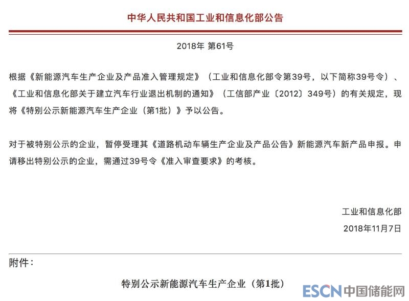 中國儲能網(wǎng)訊:工業(yè)和信息化部今日公告《特別公示新能源汽車生產(chǎn)企業(yè)(第1批)》,27家被特別公示企業(yè)將暫停受理其《道路機(jī)動車輛生產(chǎn)企業(yè)及產(chǎn)品公告》新能源汽車新產(chǎn)品申報(bào)。申請移出特別公示的企業(yè),需通過《新能源汽車生產(chǎn)企業(yè)及產(chǎn)品準(zhǔn)入管理規(guī)定》 《準(zhǔn)入審查要求》的考核。