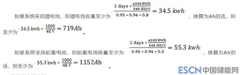 儲(chǔ)能電池容量方面,按照系統(tǒng)采用儲(chǔ)能電池作為唯一供電源可以支撐2天時(shí)間來(lái)進(jìn)行考慮。儲(chǔ)能電池的放電效率取0.95,儲(chǔ)能逆變器的效率取0.94;為了更好的保護(hù)電池,鋰電池的放電深度DOD取80%,鉛蓄電池的放電深度DOD取50%。