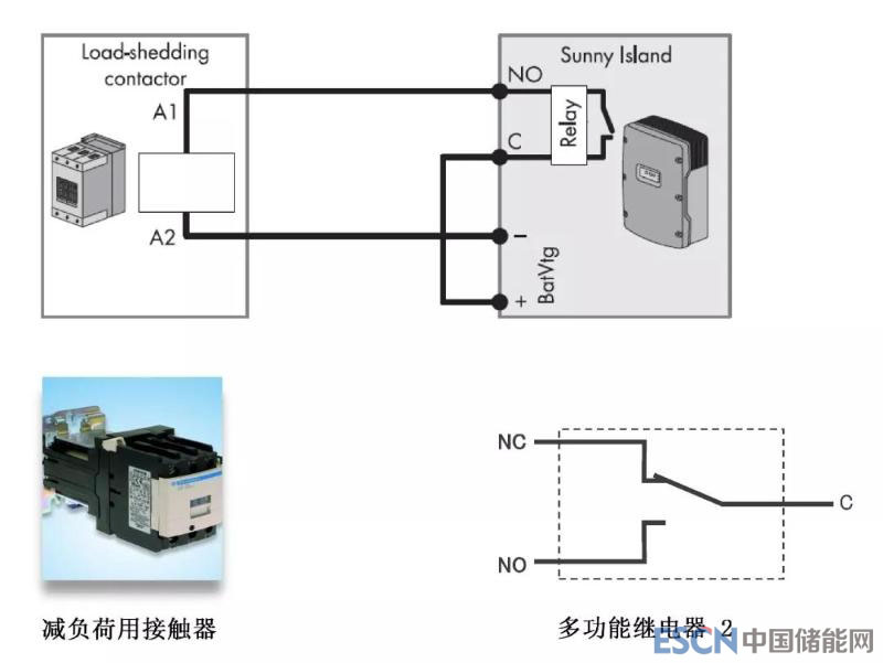 在不具備柴油發(fā)電機(jī)的離網(wǎng)系統(tǒng)中,Sunny Island可通過(guò)負(fù)載控制功能來(lái)避免當(dāng)光照不足時(shí)電池過(guò)度放電而影響電池壽命。Sunny Island具備兩個(gè)多功能繼電器口,搭配一段式減負(fù)荷用接觸器,在電池SOC過(guò)低(比如SOC=30%,可由Sunny Island進(jìn)行設(shè)置)時(shí),啟動(dòng)多功能繼電器斷開(kāi)非關(guān)鍵性負(fù)載,以防止電池過(guò)度放電。