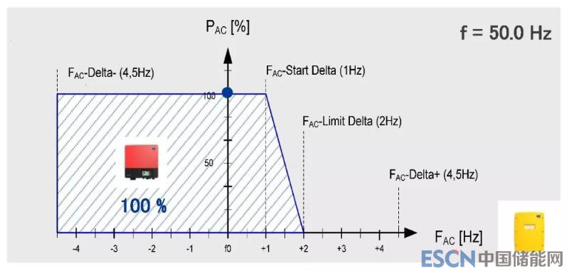 Sunny Island還具備調(diào)頻降載功能,避免電池過(guò)充。當(dāng)日照充足,光伏發(fā)電大于負(fù)載消耗且電池已充滿的情況下,Sunny Island會(huì)按照下圖曲線調(diào)整電網(wǎng)的頻率以減少PV光伏逆變器的輸出,避免過(guò)量充電而損耗電池。
