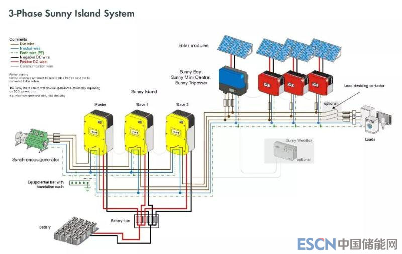 單臺(tái)SunnyIsland為單相機(jī);如接三相負(fù)載,可使用三臺(tái)Sunny Island進(jìn)行組合。