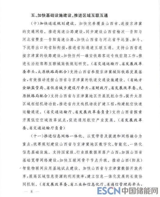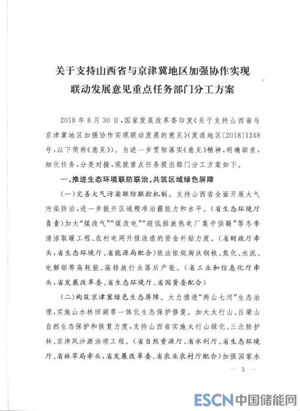 中國(guó)儲(chǔ)能網(wǎng)訊:今日山西省印發(fā)《關(guān)于支持山西省與京津冀地區(qū)加強(qiáng)協(xié)作實(shí)現(xiàn)聯(lián)動(dòng)發(fā)展意見(jiàn)重點(diǎn)任務(wù)部門(mén)分工方案的通知》。2018年8月30日,國(guó)家發(fā)改委印發(fā)《關(guān)于支持山西省與京津冀地區(qū)加強(qiáng)協(xié)作實(shí)現(xiàn)聯(lián)動(dòng)發(fā)展的意見(jiàn)》,為了落實(shí)發(fā)改委意見(jiàn)精神,明確職責(zé)、細(xì)化任務(wù),山西省計(jì)劃在“生態(tài)”、“能源”、“科技創(chuàng)新”、“醫(yī)療教育”等多個(gè)領(lǐng)域加強(qiáng)與京津冀協(xié)同合作,促進(jìn)雙方共同發(fā)展。
