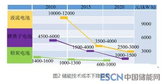 預計到2020年,目前國內(nèi)安裝量較大的磷酸鐵鋰電池的成本價有望降到人民幣1000元/(kW?h)左右。而隨著各類驗證、示范應用以及標準的建立,儲能技術的安全性也將逐步提升,達到標準要求。鉛酸電池也在不斷改進技術,多家企業(yè)已經(jīng)開始從事鉛碳電池的開發(fā),重點提升鉛酸電池的使用壽命。液流電池相關制造企業(yè)少,目前液流電池儲能系統(tǒng)的整體轉換效率約70%,尚無法與磷酸鐵鋰和先進鉛酸電池相比,但在使用壽命方面有明顯優(yōu)勢。
