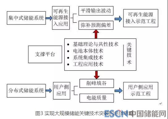第3階段(2040—2050年)是全面推廣應用階段。電化學儲能、壓縮空氣、熱相變和儲氫等不同類型的大容量電網(wǎng)儲能技術得到推廣應用。高比能電動汽車移動式鋰空氣儲能、家庭分散儲能裝置等實現(xiàn)“即插即用”。實現(xiàn)多種儲能方式的協(xié)調(diào)互補和統(tǒng)一規(guī)劃調(diào)控。大規(guī)模儲能關鍵技術突破的總體思路見圖3。