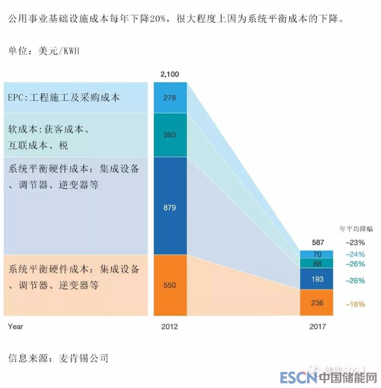 從2012年到2017年,電池成本每年下降超過15%,五年內(nèi)下降超過50%。系統(tǒng)平衡(BOS)成本(包含其它硬件,軟成本和EPC)則下降得更快,每年超過25%。