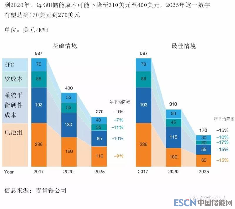 由于制造規(guī)模和技術(shù)的不斷進步以及儲能系統(tǒng)工程和設(shè)計的改進,到2025年,每千瓦時儲能系統(tǒng)安裝成本將減少約55%。除此之外,效率的提升、硬件設(shè)備的更新還能夠?qū)⒊杀窘档?0%。到2025年時,每千瓦時的儲能成本大約是170美元(不到2012年的十分之一)。