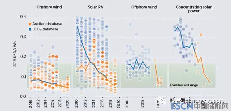 最近的拍賣和投標(biāo)結(jié)果表明,太陽(yáng)能光伏和陸上風(fēng)電的成本將繼續(xù)下降,平準(zhǔn)化度電成本將在0.03~0.04美元/千瓦時(shí)之間,到2020年甚至更低。b光熱發(fā)電(CSP)和海上風(fēng)電都是新興技術(shù),2016年和2017年的拍賣結(jié)果(未來(lái)交付)為0.06美元/千瓦時(shí)~0.10美元/千瓦時(shí)。