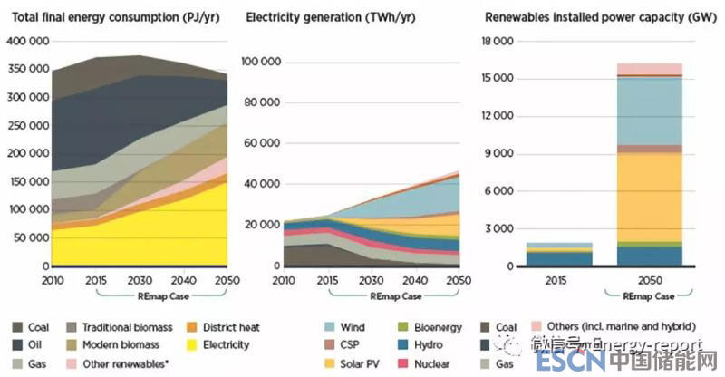 圖1.2 國(guó)際可再生能源署2050年路線圖中能源消費(fèi),發(fā)電量及可再生能源電力裝機(jī)容量