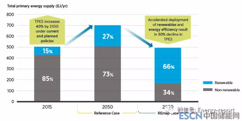 注解:EJ/yr=艾焦耳/年;REmap=國(guó)際可再生能源署可再生能源路線圖2050;TPES=一次能源供應(yīng)總量。參考情景綜合考慮了目前和計(jì)劃政策的實(shí)施結(jié)果。