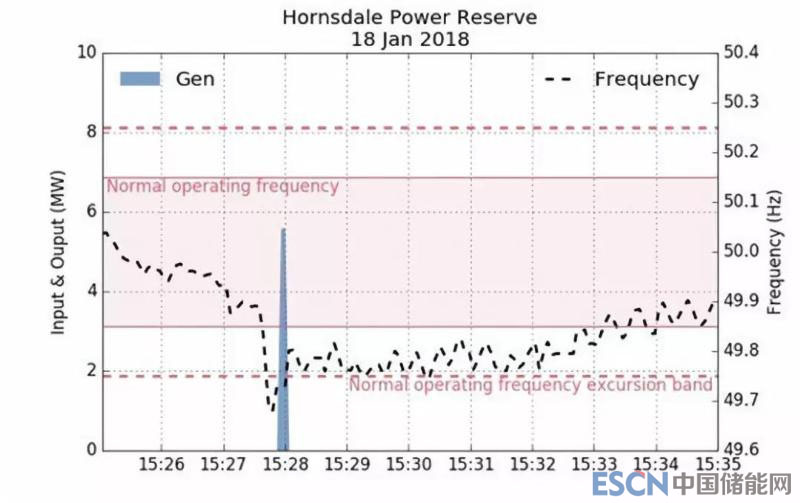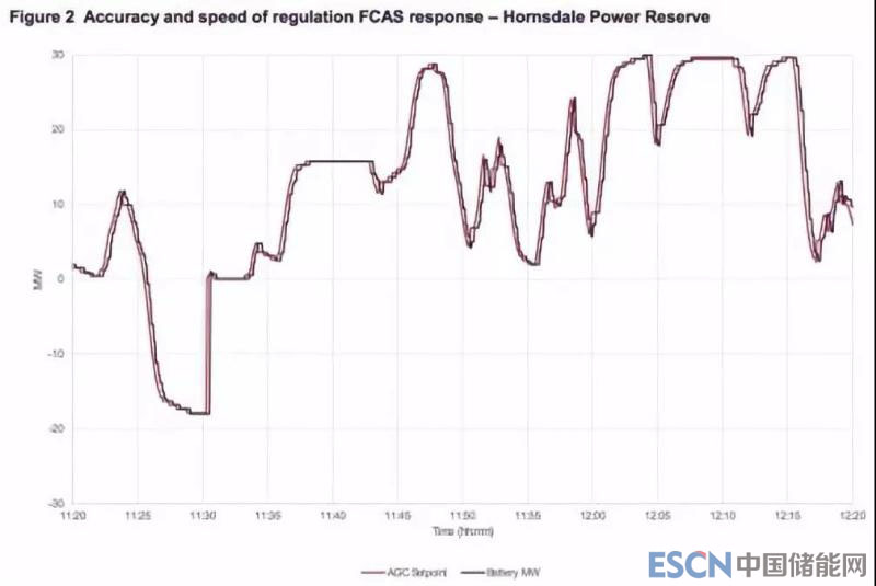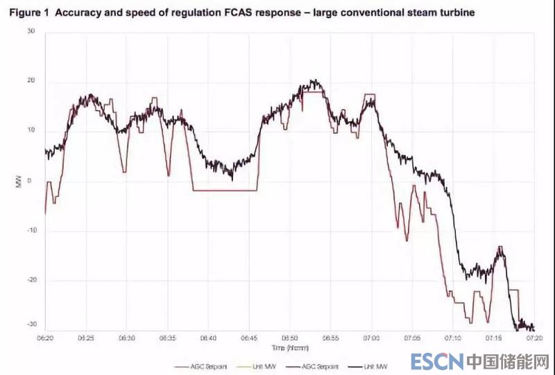 2017年12月14日,澳大利亞最大發(fā)電站之一LoyYang燃煤發(fā)電廠意外跳閘,而遠(yuǎn)在1000公里外的特斯拉電池在140毫秒內(nèi)輸送了100MW電力,12月22日LoyYang的另外一個(gè)燃煤機(jī)組發(fā)生故障,特斯拉再次出手相救,在數(shù)毫秒內(nèi)輸送16兆瓦電力。但特斯拉方面針對(duì)解救電網(wǎng)的響應(yīng)服務(wù)發(fā)出抱怨,因?yàn)殡姵仨憫?yīng)速率太快、而計(jì)費(fèi)系統(tǒng)沒有及時(shí)反應(yīng)并記錄其對(duì)電網(wǎng)服務(wù)的時(shí)間,所以并沒有收到應(yīng)有的報(bào)酬。澳大利亞能源市場(chǎng)運(yùn)營(yíng)商在一份新報(bào)告中也證實(shí),與傳統(tǒng)的汽輪機(jī)(圖3)相比,儲(chǔ)能系統(tǒng)響應(yīng)更快速、更準(zhǔn)確和更有價(jià)值(圖4)。