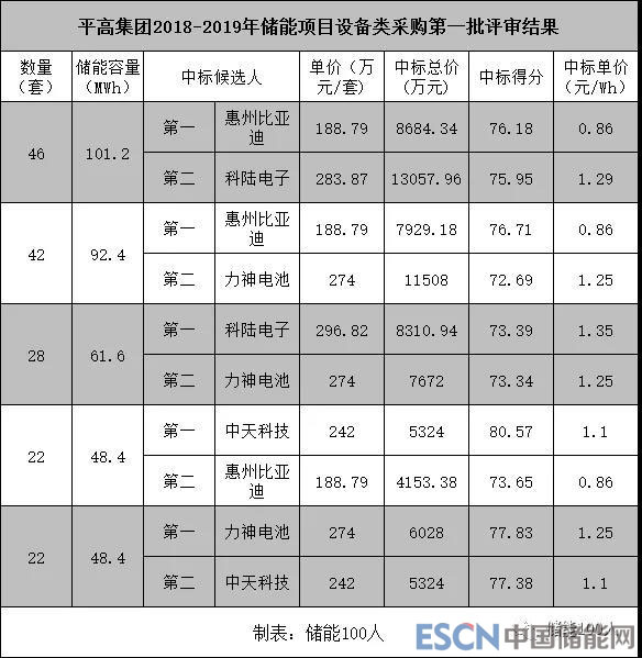 中國(guó)儲(chǔ)能網(wǎng)訊:12月6日,平高集團(tuán)發(fā)布2018-2019第一批儲(chǔ)能項(xiàng)目設(shè)備類采購(gòu)招標(biāo)結(jié)果,由于這是江蘇電網(wǎng)側(cè)儲(chǔ)能的大工程,平高此番高達(dá)352MWh的儲(chǔ)能項(xiàng)目招標(biāo),一直是業(yè)界角力的最大節(jié)點(diǎn)。通過(guò)招標(biāo),比亞迪、中天、科陸、力神中標(biāo),其中比亞迪成為最大贏家。各家中標(biāo)大致如下: