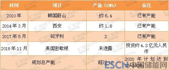LG化學(xué)在韓國、中國、波蘭和美國都建有動力電池工廠。據(jù)不完全統(tǒng)計,2011年,LG化學(xué)與現(xiàn)代Mobis合資建造梧倉工廠,初期投資290億韓元(約合1.8億元人民幣),可配套10萬輛電動車(以一輛車需要40kWh計算,產(chǎn)能約為4GWh);隨后,其與美國政府聯(lián)合在美國霍蘭德建造電池工廠,2013年投產(chǎn),可配套6萬輛電動車(以一輛車需要40kWh計算,產(chǎn)能約為2.4GWh);2015年10月,LG化學(xué)在中國南京棲霞區(qū)建造的第一座電池工廠竣工,2016年投產(chǎn),產(chǎn)能已經(jīng)達(dá)到了3GWh;2018年7月,LG化學(xué)開始在南京市江寧濱江開發(fā)區(qū)投資建設(shè)電池工廠,根據(jù)規(guī)劃將持續(xù)投資約20億美元(約合137億元人民幣),2019年10月開始投產(chǎn),預(yù)計2023年可實(shí)現(xiàn)產(chǎn)能32GWh;2018年11月,LG化學(xué)向其在2015年即已建成的波蘭工廠追加投資5億歐元(約合39億元人民幣),計劃將該工廠動力電池的年產(chǎn)能提高到70GWh。