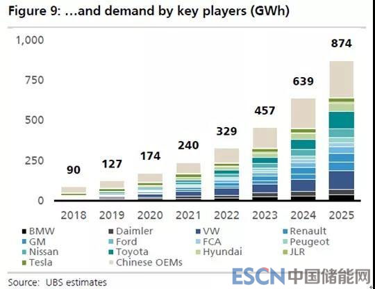 全球主要車企的電池需求量(資料來(lái)自UBS報(bào)告)