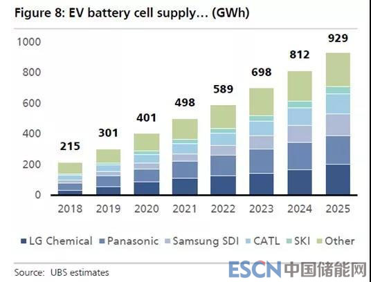 全球電動(dòng)汽車電池供給量預(yù)測(cè)(資料來(lái)自UBS報(bào)告)