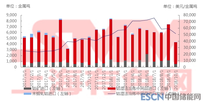中國儲(chǔ)能網(wǎng)訊:據(jù)統(tǒng)計(jì)2018年10月中國鈷原料進(jìn)口總量4,383金屬噸,環(huán)比下滑41%,同比下滑17%。進(jìn)口原料中,鈷礦進(jìn)口566.7金屬噸(按8%品位折算),環(huán)比下滑51%,同比上漲48%;鈷濕法冶煉中間品進(jìn)口3,766金屬噸(按27%品位折算),環(huán)比下跌40%,同比下跌20%。價(jià)格方面,10月鈷濕法冶煉中間品進(jìn)口進(jìn)口均價(jià)隨外媒報(bào)價(jià)繼續(xù)下滑,環(huán)比下跌13 %。