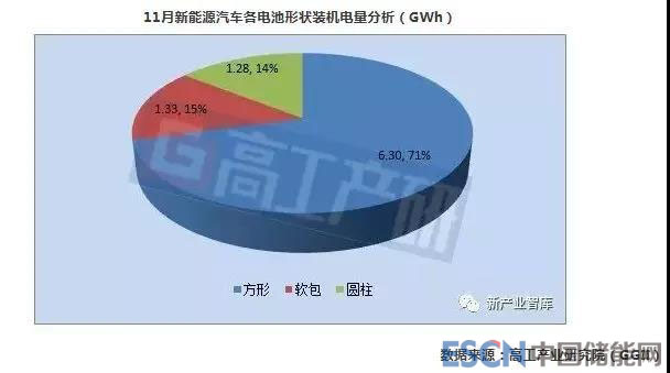 從不同電池形狀來看,11月份方形電池裝機電量約6.30GWh,占比71%,較上月下降4個百分點;軟包電池裝機電量約1.33GWh,占比15%,較上月上升1個百分點;圓柱電池裝機電量約1.28GWh,占比14%,較上月上升3個百分點。