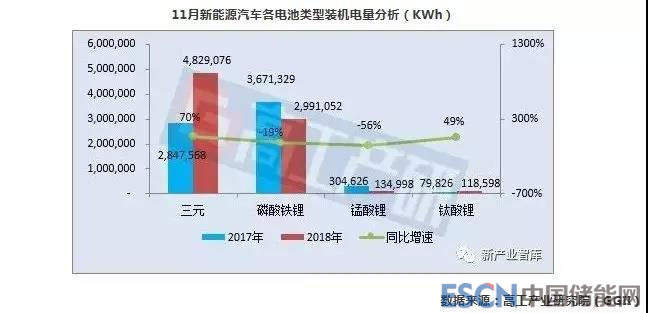 從不同電池類型來看,11月份磷酸鐵鋰電池裝機電量約2.99GWh,同比下降19%;三元電池裝機電量約4.83GWh,同比增長70%;錳酸鋰電池裝機電量約0.13GWh,同比下降56%。值得關注的是,本月份出現(xiàn)了遨優(yōu)動力配套無錫新日專用車26輛富鋰錳電池,裝機總電量887KWh。