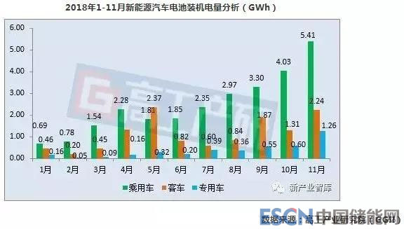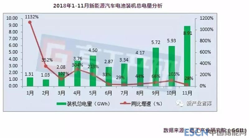 中國儲能網(wǎng)訊:高工產業(yè)研究院(GGII)通過最新發(fā)布的《動力電池字段數(shù)據(jù)庫》統(tǒng)計顯示,2018年11月我國新能源汽車生產約19.2萬輛,同比增長33%,1-11月共計生產約99.4萬輛,同比增長62%。11月動力電池裝機總電量約8.91GWh,同比增長28%。1-11月動力電池裝機總電量約43.63GWh,同比增長77%。