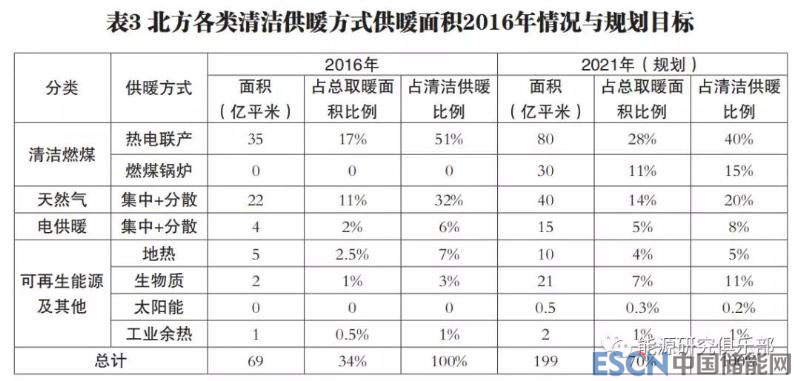根據《北方地區(qū)冬季清潔取暖規(guī)劃(2017~2021年)》,到2021年,我國北方地區(qū)清潔取暖面積將達到200億平方米,占北方地區(qū)總取暖面積的比例達70%。各類清潔供暖方式供暖面積與規(guī)劃目標詳見表3。