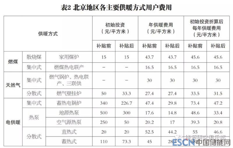 從用戶取暖價格角度,各種取暖方式經濟性由高到低依次為:集中燃煤供暖、集中天然氣供暖、分散式天然氣供暖、熱泵、分散式電取暖、蓄熱電鍋爐。計入政府補貼后,電供暖經濟性有所提高,特別是空氣源熱泵方式的供暖費用可接近燃煤集中供暖。以北京地區(qū)為例,不考慮政府補貼時,集中供暖方式下每戶供暖季支付費用不高于30元/平方米,散燒煤取暖費用使用煙煤26.9元/平方米、無煙煤45.6元/平方米,天然氣壁掛爐33.5元/平方米,熱泵供暖39.3~48.6元/平方米??紤]政府補貼后,電供暖費用可下降15%~36%,特別是空氣源熱泵,可低至20.8元/平方米,低于散燒煤供暖價格,與燃煤熱電聯產供暖相近。北京地區(qū)各主要供暖方式用戶費用詳見表2。