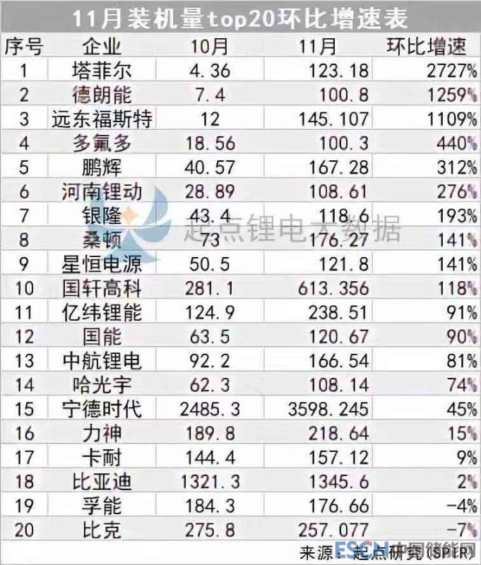 其中,國(guó)軒高科和億緯鋰能的排名前十,11月的環(huán)比增速為118%和91%,驚艷眾人。而國(guó)軒高科排名穩(wěn)居第三,但是跟十月裝機(jī)量相比,翻倍的增長(zhǎng)速度,