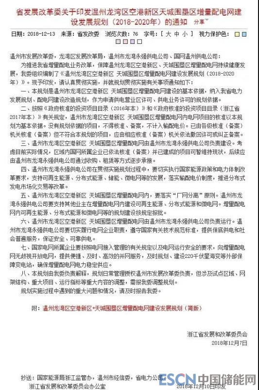 中國儲能網(wǎng)訊:日前,浙江省發(fā)改委發(fā)布了《溫州龍灣區(qū)空港新區(qū) 天城圍墾區(qū)增量配電網(wǎng)建設(shè)發(fā)展規(guī)劃(2018-2020年)的通知》,通知中稱,規(guī)劃是溫州市龍灣區(qū)空港新區(qū)、天城圍墾區(qū)增量配電網(wǎng)建設(shè)的基本依據(jù),納入浙江省電力發(fā)展規(guī)劃、配電網(wǎng)建設(shè)改造規(guī)劃,作為申請供電營業(yè)區(qū)許可、供電業(yè)務(wù)許可的規(guī)劃依據(jù)。溫州市龍灣區(qū)空港新區(qū)、天城圍墾區(qū)增量配電網(wǎng)由溫州市龍灣永強(qiáng)供電公司負(fù)責(zé)建設(shè)??紤]目前實(shí)際情況,區(qū)域內(nèi)國網(wǎng)所屬企業(yè)已依法核準(zhǔn)(備案)并已建成的項(xiàng)目可暫維持現(xiàn)狀,后續(xù)應(yīng)由溫州市龍灣永強(qiáng)供電公司通過收購、租賃等方式逐步承接。