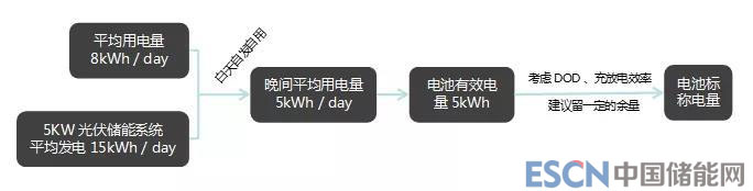 最理想狀態(tài)是,光伏+儲能系統(tǒng)能夠完全覆蓋家庭用電。但是這種情況很難實現(xiàn)。所以我們綜合考慮投入成本和用電情況,可以選擇根據(jù)家庭平均日用電量(kWh)來選擇電池的容量(默認光伏系統(tǒng)能量充足)。設計邏輯如下 :