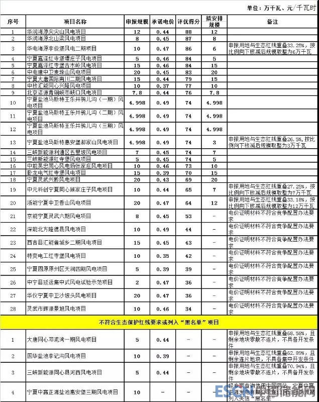 寧夏風(fēng)電基地2018年度風(fēng)電項(xiàng)目競(jìng)爭(zhēng)配置評(píng)優(yōu)結(jié)果公示表