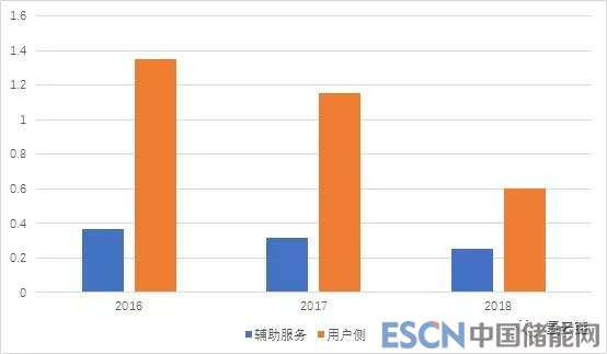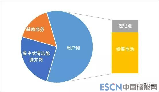 自2015年起,我國的電化學儲能裝機容量保持每年10%以上的增幅逐年遞增。根據CNESA統(tǒng)計,2017年我國新增的電化學儲能裝機容量中,用戶側的新增容量比例最大,為59%;新增容量中,用于輔助服務和集中式清潔能源并網的主要為鋰電池,而能量成本較低的鉛蓄電池主要集中在用戶側,占用戶側新增裝機容量的77%。