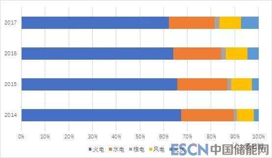 圖2 2014-2017年度全國發(fā)電裝機總容量比例
