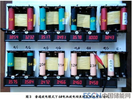 而在均衡放電實(shí)驗(yàn)中,臨近放電結(jié)束前,電壓一直處于相對(duì)最低的卻是11#電池,而不是6#電池,同樣也不是2#電池,主要原因就是均衡器的介入自動(dòng)改變了每塊電池的實(shí)際放電電流,明顯降低了2#和6#電池的實(shí)際放電電流,在常規(guī)放電實(shí)驗(yàn)中,1#和7#電池的電壓一直處于最高狀態(tài),直至放電結(jié)束,顯示出這兩塊電池的容量最大。