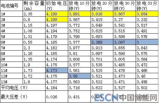 從放電測(cè)量數(shù)據(jù)可以看出,放電至33分鐘時(shí),6#電池到達(dá)放電截止電壓,停止放電,此時(shí),2#電池的電量也即將放完,但其他11塊電池仍具有較多的電量沒有釋放出來(lái),放電結(jié)束時(shí)的電壓就說明了一切,特別是1#和7#電池還剩余非常多的電量沒有釋放,無(wú)法利用,這種情況特別像安裝了具有單體電池放電保護(hù)的BMS電池管理系統(tǒng)的動(dòng)力電池組。