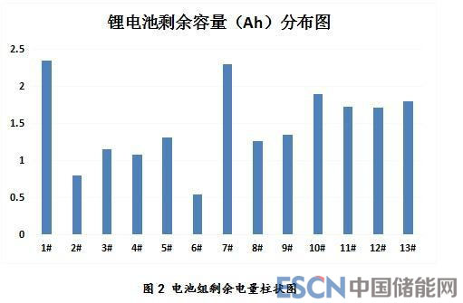 在充滿電后靜止2小時(shí)進(jìn)行容量檢測(cè)的情況下,1A放電檢測(cè)實(shí)際剩余容量只有550mAh至2350mAh之間,見表1剩余容量欄,通過檢測(cè)容量可以看出,容量差異非常大,最大差值達(dá)1.8Ah,實(shí)驗(yàn)電池共計(jì)13塊,所有電池剩余電量柱狀圖如圖2 所示。