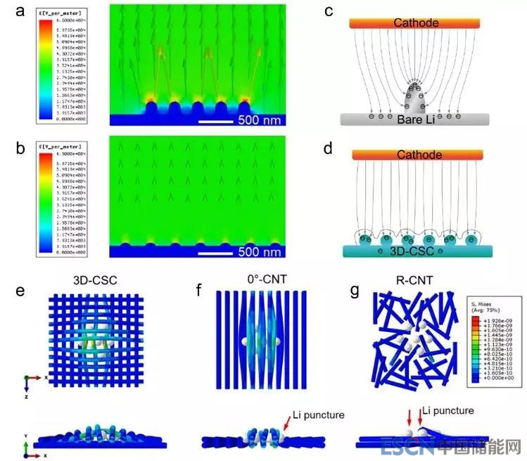 圖1. (a)-(d)常見鋰箔負(fù)極和鋰/碳管骨架復(fù)合電極鋰沉積的仿真電場(chǎng)模擬及示意圖,具有高比表面積的3D-CSC導(dǎo)電骨架能有效避免電勢(shì)集中,促進(jìn)均勻沉積。(e)-(g)不同幾何結(jié)構(gòu)碳納米管骨架在鋰金屬沉積量增大時(shí)的應(yīng)力分析模擬。