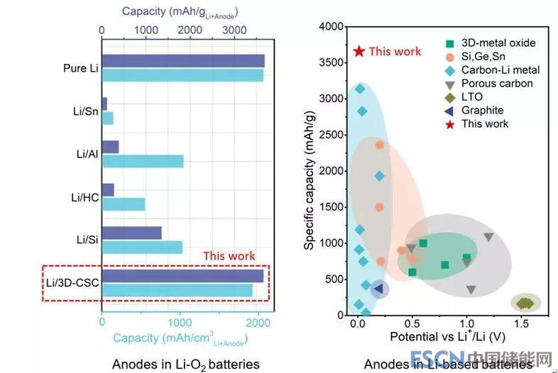 圖2. 交錯(cuò)碳納米管復(fù)合鋰金屬負(fù)極(Li/3D-CSC)與其他應(yīng)用于鋰氧電池中的負(fù)極性能對(duì)比(左)及與其他典型鋰電極的性能對(duì)比(右)。