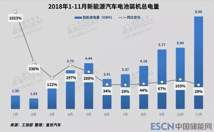 根據(jù)蓋世汽車研究院統(tǒng)計(jì),11月動(dòng)力電池裝機(jī)量為8.96GWh,同比增長(zhǎng)28.8%,環(huán)比增長(zhǎng)50.9%。1-11月累計(jì)裝機(jī)量為43.7GWh,累計(jì)同比增長(zhǎng)76.8%。