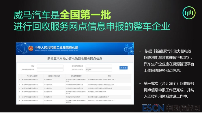 另外,依據(jù)《新能源汽車動力蓄電池回收利用溯源管理暫行規(guī)定》,汽車生產(chǎn)企業(yè)應(yīng)在溯源管理平臺上傳回收服務(wù)網(wǎng)點信息,威馬汽車第一批次(合計26個)回收服務(wù)網(wǎng)點信息申報工作已完成,并納入回收利用體系建設(shè)工作中,成為全國第一批進(jìn)行回收服務(wù)網(wǎng)點信息申報的整車企業(yè)。