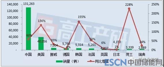 2018年11月中國新能源乘用車銷售約13.1萬輛,占全球新能源乘用車銷量的61%,同比增長60%;美國新能源乘用車銷售約4萬輛,同比增長136%。