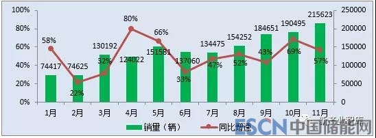 高工產(chǎn)業(yè)研究院(GGII)通過發(fā)布的《新能源汽車產(chǎn)業(yè)鏈數(shù)據(jù)庫》統(tǒng)計(jì)顯示,2018年11月全球新能源乘用車銷售約21.6萬輛,同比增長57%。