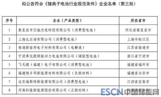 同在1月2日,工業(yè)和信息化部發(fā)布第69號(hào)公告,根據(jù)根據(jù)《鋰離子電池行業(yè)規(guī)范條件》(工業(yè)和信息化部公告2015年第57號(hào))及《鋰離子電池行業(yè)規(guī)范公告管理暫行辦法》(工信部電子〔2015〕452號(hào)),對(duì)第三批符合《鋰離子電池行業(yè)規(guī)范條件》企業(yè)名單進(jìn)行公示。