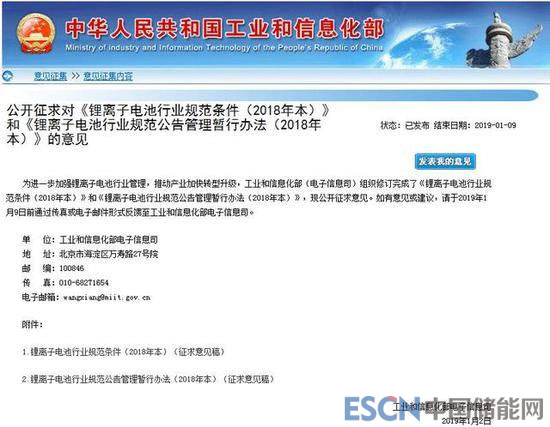 國(guó)家工業(yè)和信息化部電子信息司1月2日在其官網(wǎng)表示,為進(jìn)一步加強(qiáng)鋰離子電池行業(yè)管理,推動(dòng)產(chǎn)業(yè)加快轉(zhuǎn)型升級(jí),工業(yè)和信息化部(電子信息司)組織修訂完成了《鋰離子電池行業(yè)規(guī)范條件(2018年本)》和《鋰離子電池行業(yè)規(guī)范公告管理暫行辦法(2018年本)》(以下簡(jiǎn)稱(chēng)“辦法”),現(xiàn)公開(kāi)征求意見(jiàn)。如有意見(jiàn)或建議,請(qǐng)于2019年1月9日前通過(guò)傳真或電子郵件形式反饋至工業(yè)和信息化部電子信息司。該信息在行業(yè)內(nèi)引起了廣泛關(guān)注。