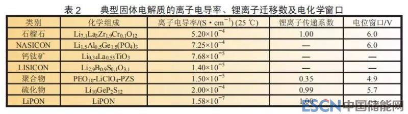 近幾年來,為了進(jìn)一步提高鋰電池的比能量和安全性,國內(nèi)掀起了固態(tài)鋰電池研究的熱潮,其核心技術(shù)是高穩(wěn)定高電導(dǎo)率的固體電解質(zhì)材料和固體電解質(zhì)與電極材料的界面控制技術(shù)。固態(tài)鋰電池與傳統(tǒng)鋰電池工作原理相通,然而由于關(guān)鍵部件均為固態(tài),界面更加復(fù)雜,界面相容性直接影響固態(tài)電池性能。固體電解質(zhì)主要包括聚合物、氧化物和硫化物三類。各種固體電解質(zhì)性能對比如表2所示。目前來看,日本以豐田為代表,體系以硫化物固體電解質(zhì)為主,同時研制的雙極性固態(tài)電池平均電壓為14.4V,預(yù)計于2022年推出搭載固態(tài)電池的首款電動汽車,技術(shù)水平國際領(lǐng)先;韓國以硫化物、無機/有機復(fù)合物為主,三星橫濱研究院研制出2Ah硫化物固態(tài)電池,可獲得200Wh/kg和500Wh/L的比能量,處于小試階段;法國和加拿大以PEO基聚合物為主,已具備小規(guī)模生產(chǎn)能力;美國Sakti3(Dyson)等的研究重點是LiPON基超薄氧化物固態(tài)電池,但目前處于實驗室階段;國內(nèi)百花齊放,有機/無機復(fù)合固體電解質(zhì)實用化推進(jìn)較快,特別是贛鋒鋰業(yè)在國內(nèi)率先制備出容量4~10Ah的軟包裝全固態(tài)鋰電池,比能量最高達(dá)到286Wh/kg(628Wh/L),千次循環(huán)容量保持率為87.6%,投資2.4億建設(shè)第一代固態(tài)鋰電池研發(fā)中試生產(chǎn)線。