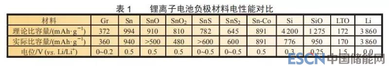 石墨材料的快速崛起得益于電解液和石墨材料的技術(shù)創(chuàng)新。石墨材料主要可以分為人造石墨和天然石墨兩類,中國鋰離子電池負(fù)極材料產(chǎn)業(yè)化研究是從人造石墨開始的。其中,中間相碳微球(MCMB)材料具有高振實密度和低比表面積的優(yōu)點,從而減少了首次充電過程中SEI膜的形成、降低了不可逆容量,因此MCMB被廣泛應(yīng)用。但是其生產(chǎn)溫度高達(dá)2800℃,因此成本一直居高不下。而天然石墨在成本上非常低廉,但是PC的共嵌入問題影響了天然石墨的應(yīng)用,因此天然石墨需要EC含量較高的電解液或者對天然石墨的表面進(jìn)行改性處理,而且表面修飾的天然石墨是目前市場的主流。此外,軟碳和硬碳材料具有較高的鋰離子嵌入電位,尤其硬碳材料層間距達(dá)到0.372nm,更易于鋰離子擴散。因此,軟碳和硬碳材料已經(jīng)被作為復(fù)合負(fù)極的一部分,用于動力電池負(fù)極,滿足快充和低溫充電的要求。這一時期,合金負(fù)極材料也得到了廣泛的關(guān)注,例如Si和Sn材料,但是這些材料在嵌鋰過程中巨大的體積膨脹限制了它們的應(yīng)用。現(xiàn)在,為追求更高的能量密度,Si-C材料和SiO材料開發(fā)取得顯著進(jìn)展,中科院物理所擁有元霄結(jié)構(gòu)的碳包覆硅材料專利,中國電科十八所在國內(nèi)率先提出了SiO高溫處理穩(wěn)定化等新方法,推進(jìn)了硅基材料的技術(shù)進(jìn)步。此外,研究發(fā)現(xiàn)硅基材料在含氟溶劑電解液中循環(huán)十分穩(wěn)定,其穩(wěn)定后庫侖效率可達(dá)99.8%,部分解決了硅材料循環(huán)過程中表面狀態(tài)不穩(wěn)定的難題。在過去十余年中,國內(nèi)亦對其他金屬及化合物負(fù)極進(jìn)行了積極的研究。它們包括金屬形式的金屬負(fù)極,金屬間化合物,氧化物和含氧鹽(包括磷酸鹽和碳酸鹽、氧化釩、氧化鉬、基于TiO2的納米結(jié)構(gòu)材料),以及氟化物、硫化物、硒化物、氮化物、磷化物、銻化物等嵌鋰后發(fā)生相轉(zhuǎn)化的電極材料。此外,具有零應(yīng)變的Li4Ti5O12材料由于其電位高、具有可快充和低溫充電的優(yōu)勢,取得了一定程度的應(yīng)用,可應(yīng)用于快充電池和混合動力及48V起停電池。表1所示為各種鋰離子電池負(fù)極材料性能對比。