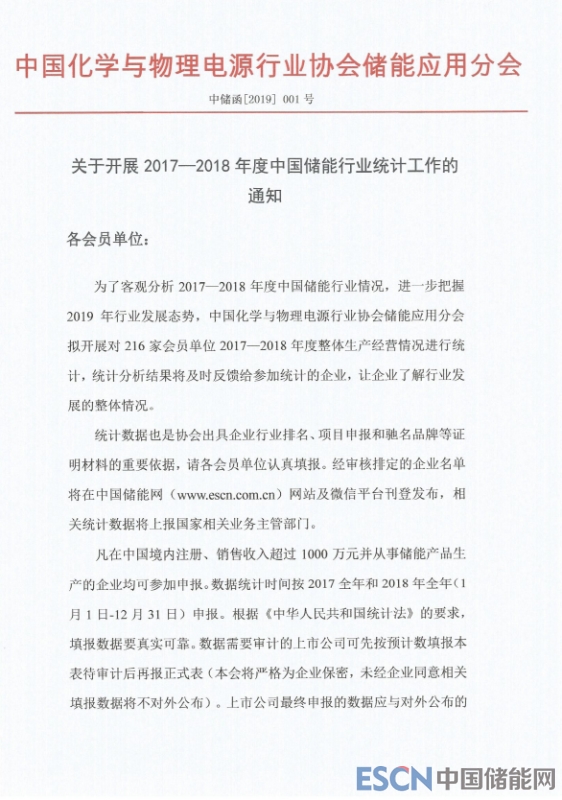關(guān)于開(kāi)展2017—2018年度中國(guó)儲(chǔ)能行業(yè)統(tǒng)計(jì)工作的通知