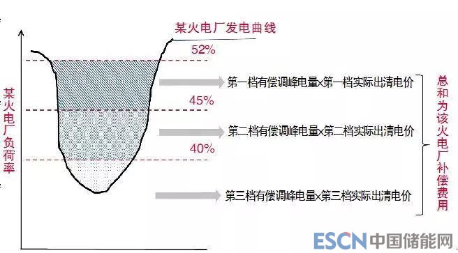 東北調(diào)峰服務(wù)市場體現(xiàn)公平、自愿的原則,并實(shí)現(xiàn)全電網(wǎng)調(diào)峰成本最低。根據(jù)火電機(jī)組調(diào)峰深度的不同,采用“階梯式”補(bǔ)償及分?jǐn)倷C(jī)制,按照非線性比例“多減多得、少減多罰”的原則加大獎罰力度,以激勵發(fā)電企業(yè)加大提供調(diào)峰服務(wù)的意愿。調(diào)峰服務(wù)分為基本(無償)調(diào)峰服務(wù)以及有償調(diào)峰服務(wù)(針對靈活性供方)?;菊{(diào)峰服務(wù)指機(jī)組調(diào)峰率小于等于48%時所提供的輔助服務(wù);有償調(diào)峰服務(wù)指機(jī)組調(diào)峰率大于48%或按調(diào)度要求進(jìn)行啟停調(diào)峰所提供的服務(wù)。假設(shè)某火電廠提供了深度調(diào)峰有償調(diào)峰服務(wù),其發(fā)電曲線如圖2所示,則以每檔電價與積分電量計(jì)算每檔補(bǔ)償,三檔補(bǔ)償總計(jì)為其補(bǔ)償費(fèi)用。由于火電機(jī)組參與深度調(diào)峰有必要進(jìn)行穩(wěn)燃技術(shù)改造,并且可能需要投油,增大發(fā)電成本,這種降低發(fā)電功率反而增大成本的情況是無法通過國外的現(xiàn)貨價格來真實(shí)反映的。