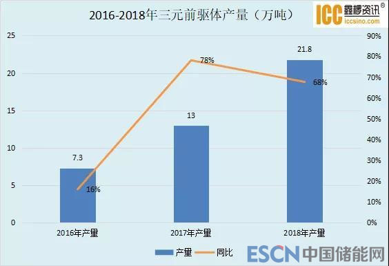 中國(guó)儲(chǔ)能網(wǎng)訊:隨著三元鋰電池需求量的增長(zhǎng),2018年國(guó)內(nèi)三元前驅(qū)體行業(yè)迅速擴(kuò)張。據(jù)鑫欏資訊對(duì)國(guó)內(nèi)16家三元前驅(qū)體企業(yè)產(chǎn)量的統(tǒng)計(jì)情況來(lái)看,2018年三元前驅(qū)體產(chǎn)量為21.8萬(wàn)噸,同比去年增長(zhǎng)68%。