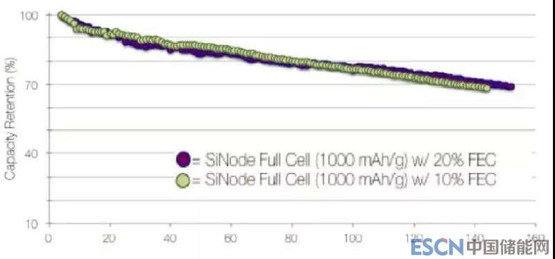 合作方A123已經(jīng)可以實現(xiàn)實驗室規(guī)模的負(fù)極(1000mAh/g)涂布。與NCA正極制備成全電池,使用含10%和20%FEC電解液的兩種電芯的循環(huán)性能相當(dāng)。